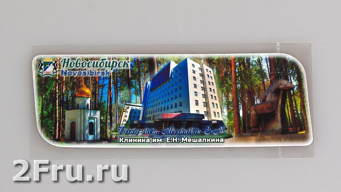 Гибкий сувенирный магнит на холодильник с коллажем из фото Новосибирской клиники им. Мешалкина. Размеры магнита: 14х5 см., толщина - 1 мм. Магнит упакован в полипропиленовый пакет.