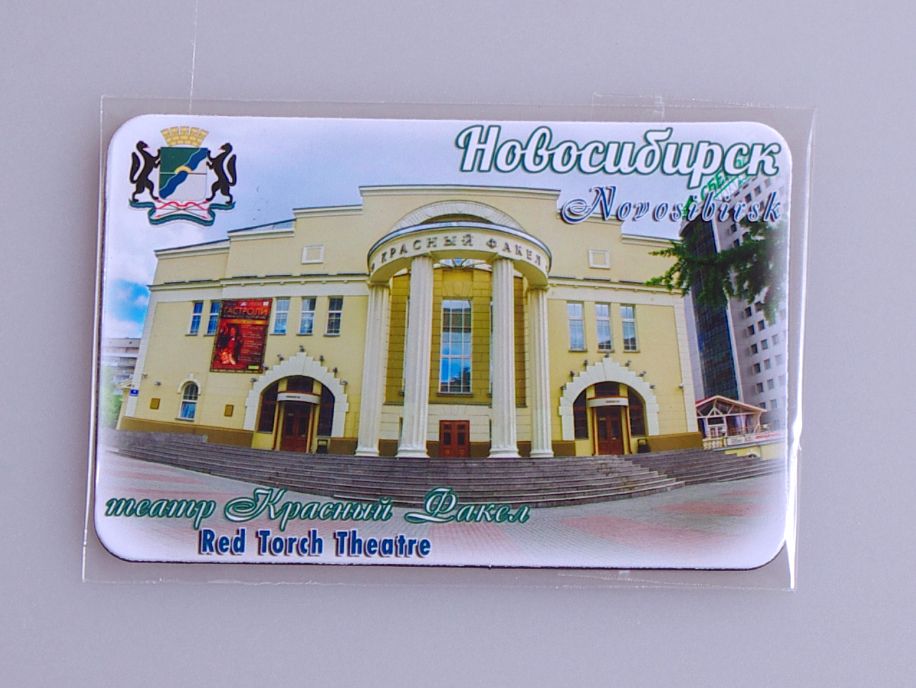 Гибкий сувенирный магнит на холодильник с фото Новосибирского театра Красный Факел. Размеры магнита: 8,4х5,7 см., толщина - 1 мм. Магнит упакован в полипропиленовый пакет.