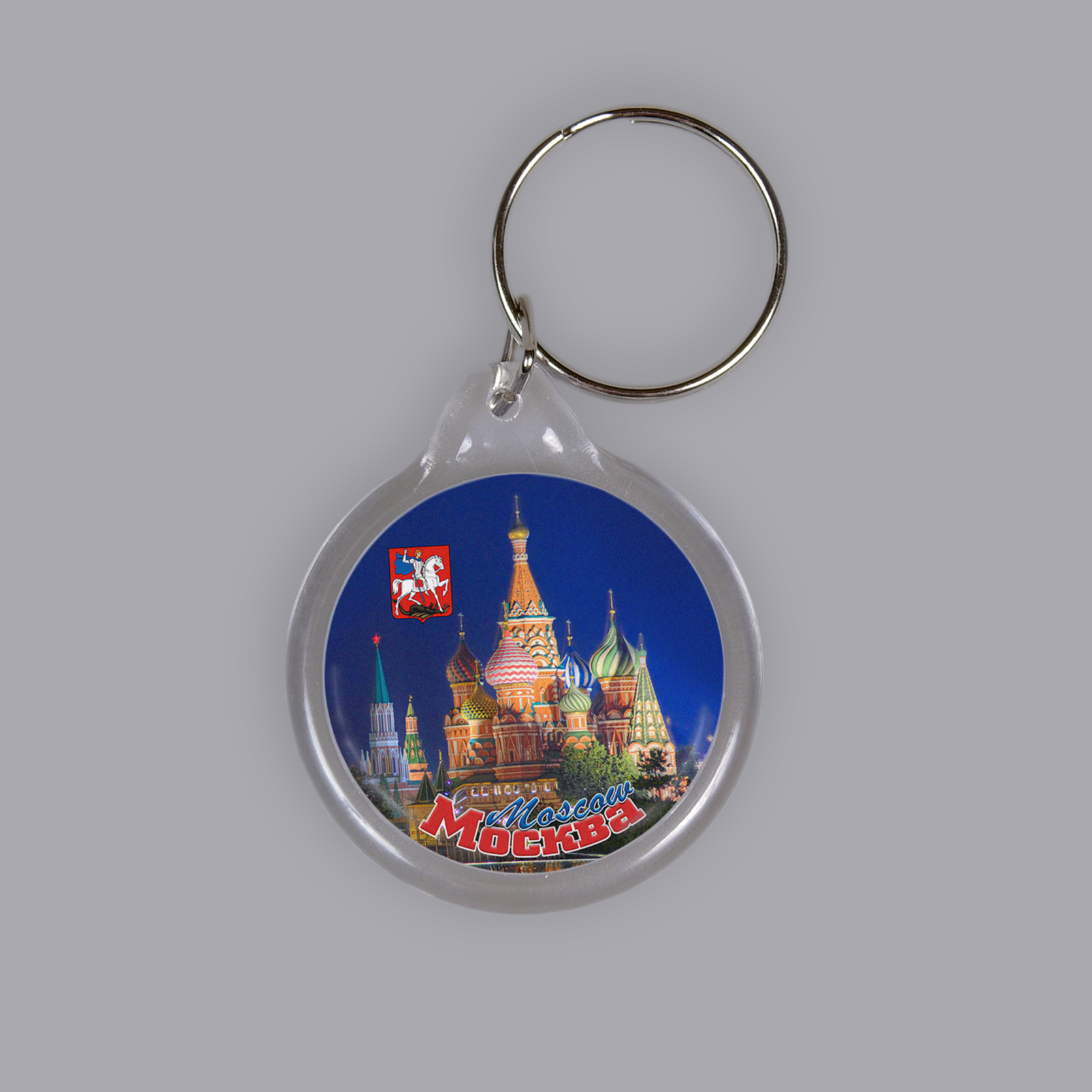На брелке изображена фотография Храма Василия Блаженного вечером, Москва.