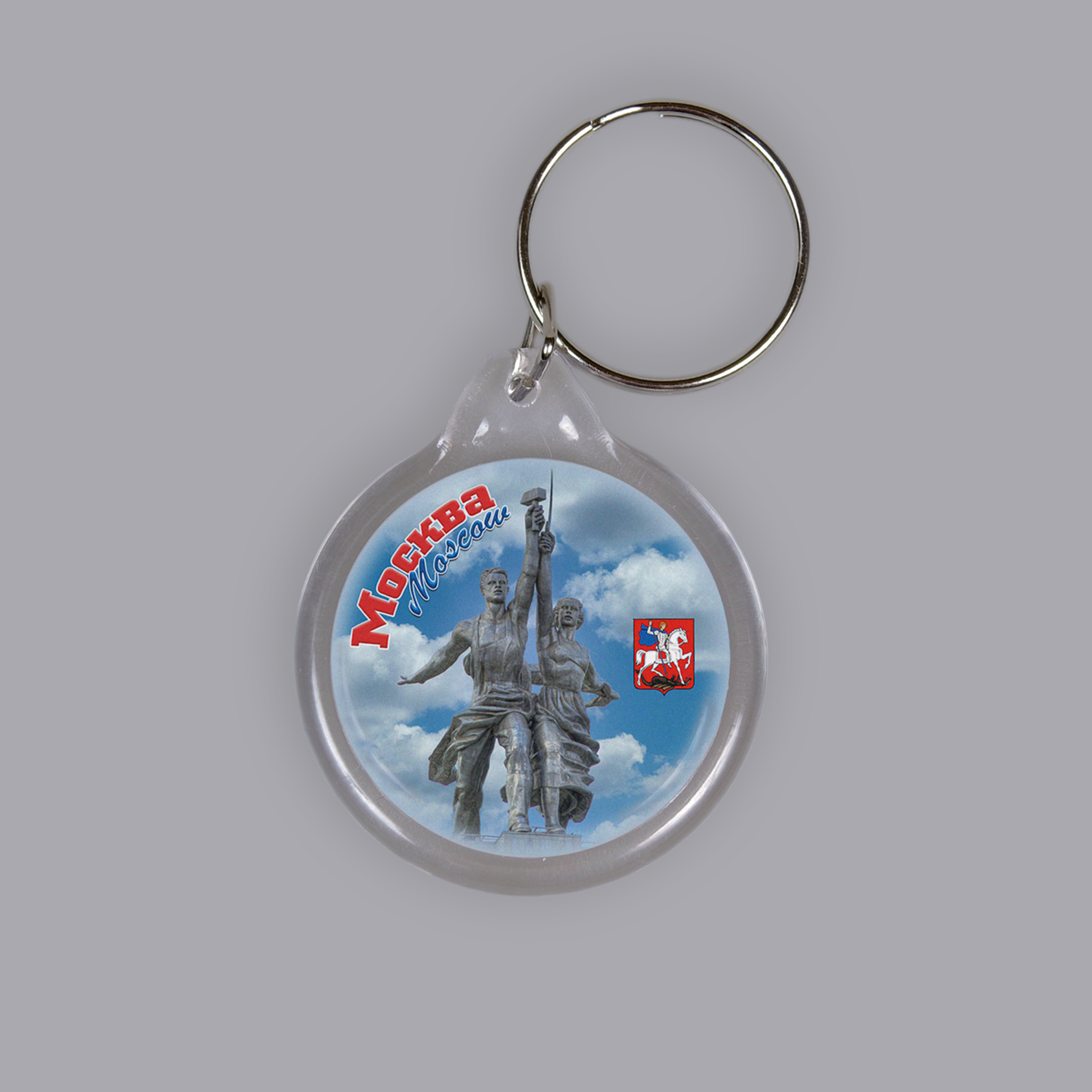 На брелке изображена фотография Московского монумента "Рабочий и Колхозница" расположенного на одноимённом павильоне парка ВДНХ.
