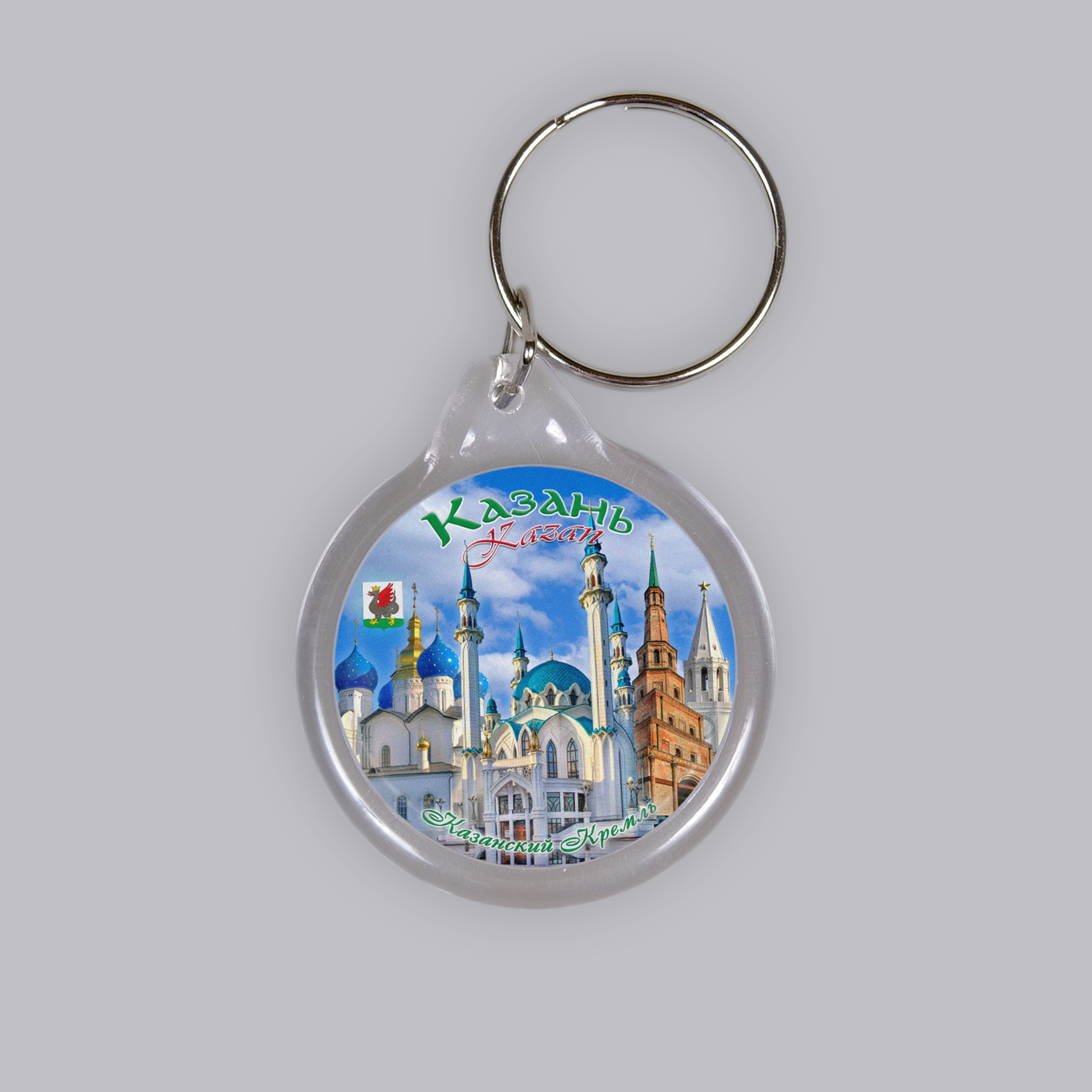 Пластиковый (акриловый) сувенирный брелок с коллажем из фотографий достопримечательностей Казанского Кремля. Изображение с обеих сторон. Размеры брелка: круг диаметр 40 мм., толщина - 10 мм. Брелок упакован в зип-лок пакет.