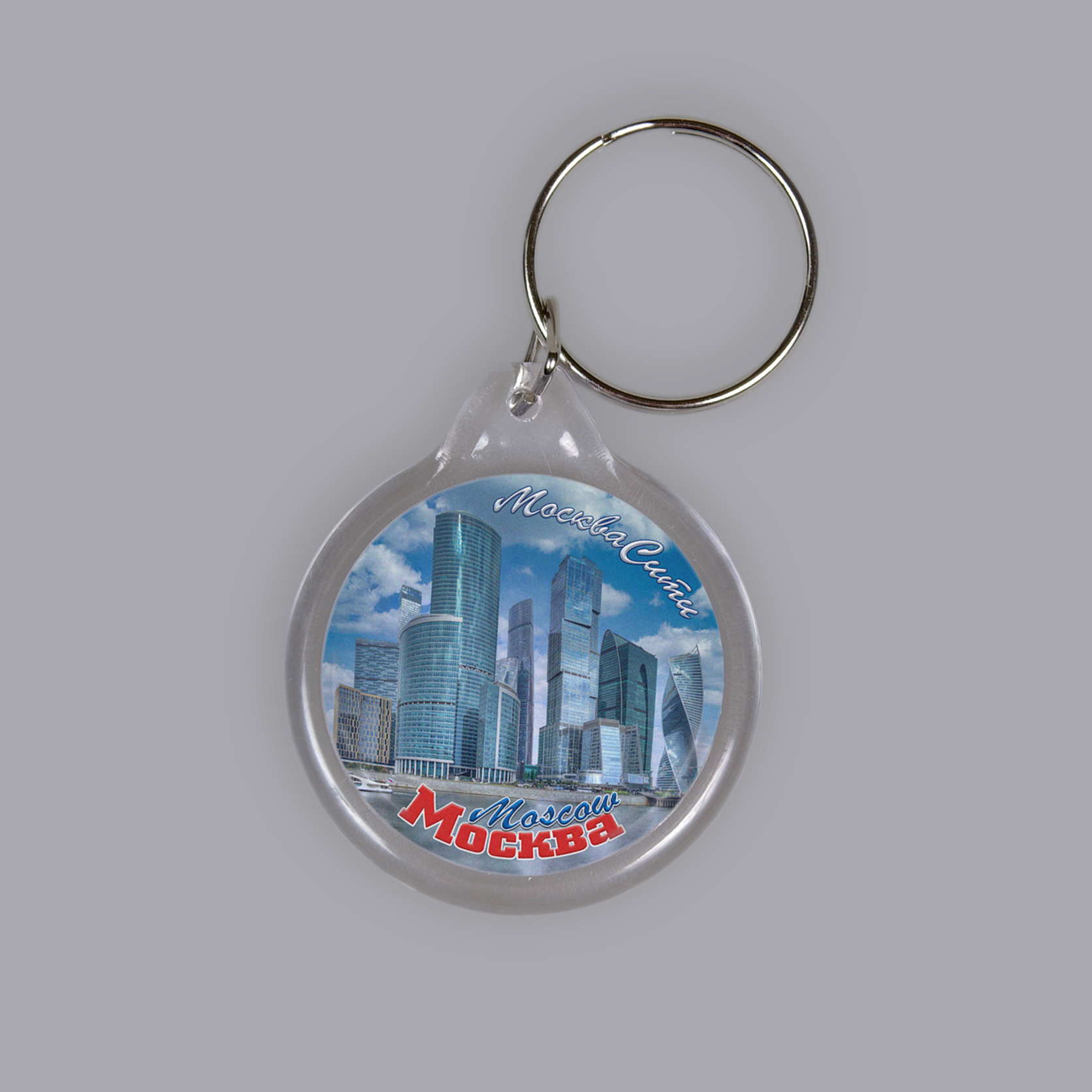 Пластиковый (акриловый) сувенирный брелок с фотографией делового центра "Москва-Сити". Изображение с обеих сторон. Размеры брелка: круг диаметр 40 мм., толщина - 10 мм. Брелок упакован в зип-лок пакет.