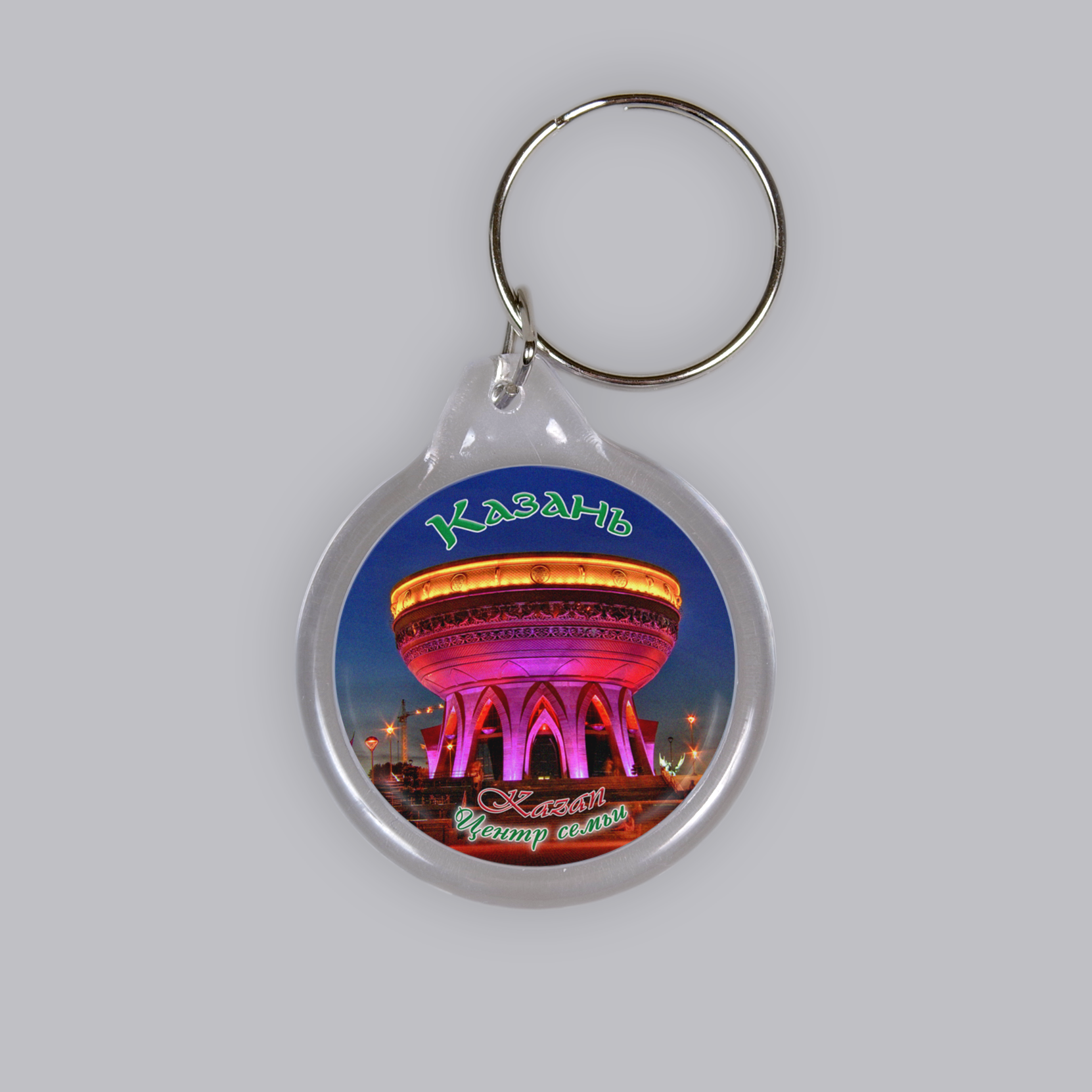 Пластиковый (акриловый) сувенирный брелок с фотографией Центра семьи Казан, Казань. Изображение с обеих сторон. Размеры брелка: круг диаметр 40 мм., толщина - 10 мм. Брелок упакован в зип-лок пакет.