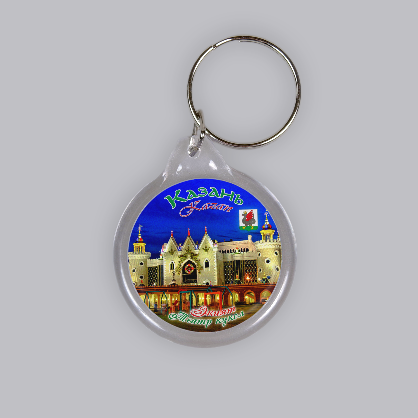 Пластиковый (акриловый) сувенирный брелок с фотографией театра кукол Экият, Казань. Изображение с обеих сторон. Размеры брелка: круг диаметр 40 мм., толщина - 10 мм. Брелок упакован в зип-лок пакет.