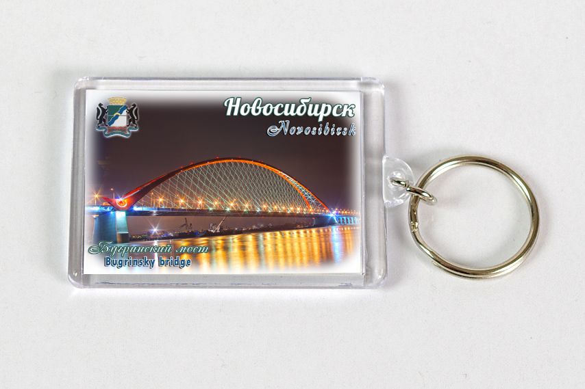 На брелке изображен Бугринский мост через реку Обь, вечером с подсветкой. Автомобильный мост через Обь с самым длинным в СНГ арочным пролётом. Мост был открыт в 8 октября 2014 года. В будущем планируется что мост станет составной частью скоростной магистрали непрерывного действия «Юго-Западный обход» Новосибирска, которой предполагается связать федеральные трассы «Иртыш» и «Чуйский тракт».