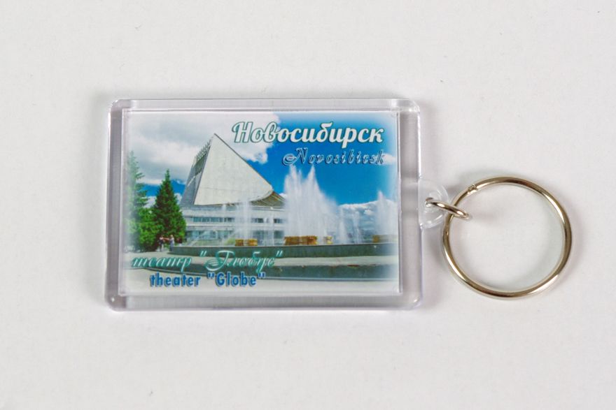 На брелке изображен фонтан возле Новосибирского академического молодёжного театра "Глобус". Это один из старейших театров Новосибирска, он был основан в 1930 году. Современное здание театра построено в 1984 году, по адресу улица Каменская, д. 1. Раньше театр находился в здании Дома Ленина на Красном проспекте 32, где теперь находится Новосибирская филармония.