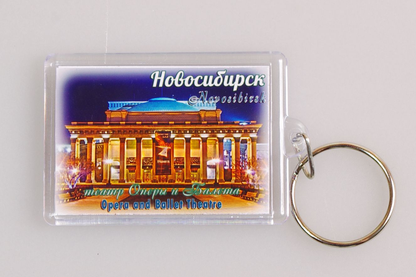 Пластиковый (акриловый) сувенирный брелок с фото Новосибирского театра Оперы и Балета вечером. Изображение с обеих сторон. Размеры брелка: 40х56 мм., толщина - 10 мм. Брелок упакован в зип-лок пакет.