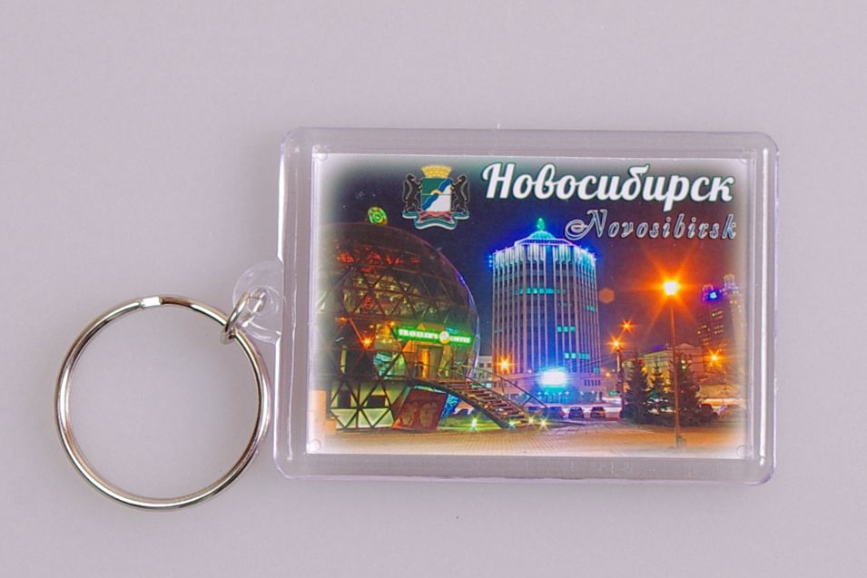 Пластиковый (акриловый) сувенирный брелок с вечерним фото Новосибирска, вид из сквера у театра "Глобус". Изображение с обеих сторон. Размеры брелка: 40х56 мм., толщина - 10 мм. Брелок упакован в зип-лок пакет.