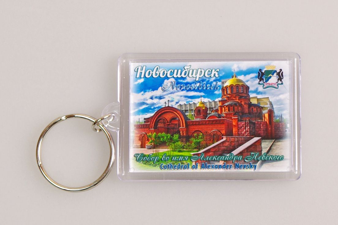 Пластиковый (акриловый) сувенирный брелок с фото собора во имя Александра Невского, Новосибирск. Изображение с обеих сторон. Размеры брелка: 40х56 мм., толщина - 10 мм. Брелок упакован в зип-лок пакет.
