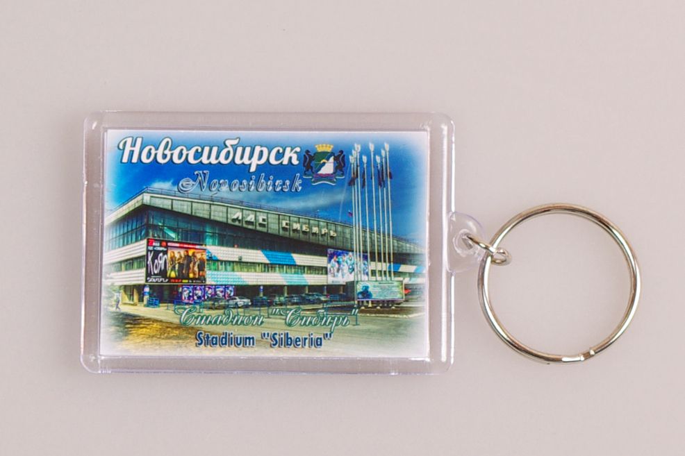 Пластиковый (акриловый) сувенирный брелок с фото Новосибирского стадиона "Сибирь". Изображение с обеих сторон. Размеры брелка: 40х56 мм., толщина - 10 мм. Брелок упакован в зип-лок пакет.