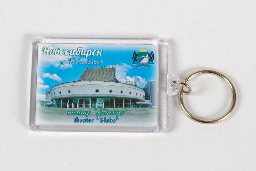 Пластиковый (акриловый) сувенирный брелок с фото Новосибирского театра Глобус. Изображение с обеих сторон. Размеры брелка: 40х56 мм., толщина - 10 мм. Брелок упакован в зип-лок пакет.