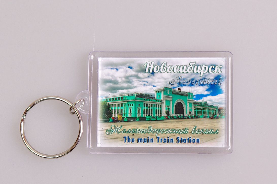 Пластиковый (акриловый) сувенирный брелок с фото железнодорожного вокзала Новосибирск-Главный. Изображение с обеих сторон. Размеры брелка: 40х56 мм., толщина - 10 мм. Брелок упакован в зип-лок пакет.