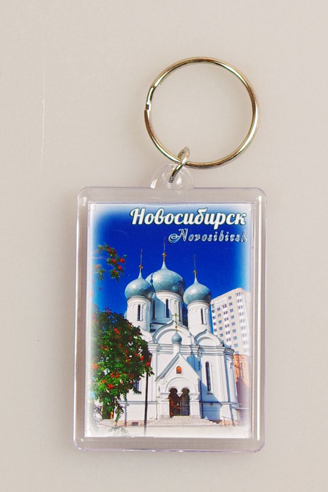 Пластиковый (акриловый) сувенирный брелок с фото церкви на Учительской в Новосибирске. Изображение с обеих сторон. Размеры брелка: 40х56 мм., толщина - 10 мм. Брелок упакован в зип-лок пакет.