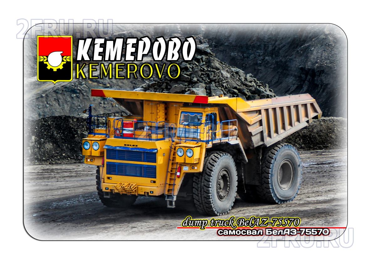Гибкий сувенирный магнит на холодильник с фото самосвала БелАЗ везущего уголь, Кемерово. Размеры магнита: 8х6 см., толщина - 1 мм. Магнит упакован в полипропиленовый пакет.