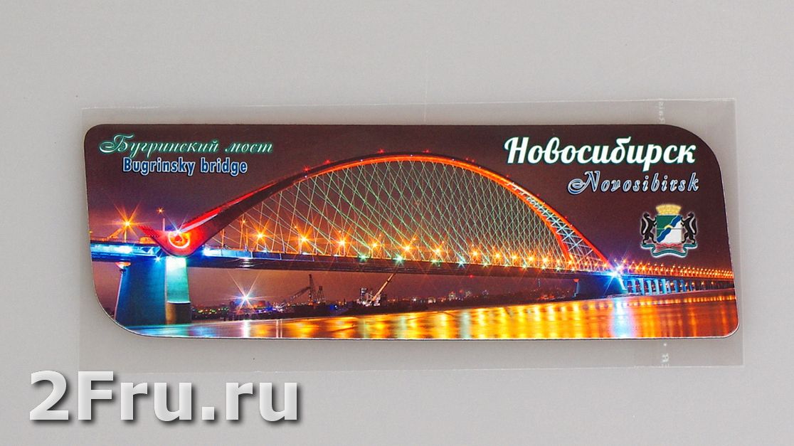 На магните изображен Бугринский мост через реку Обь, вечером с подсветкой. Автомобильный мост через Обь с самым длинным в СНГ арочным пролётом. Мост был открыт в 8 октября 2014 года. В будущем планируется что мост станет составной частью скоростной магистрали непрерывного действия «Юго-Западный обход» Новосибирска, которой предполагается связать федеральные трассы «Иртыш» и «Чуйский тракт».