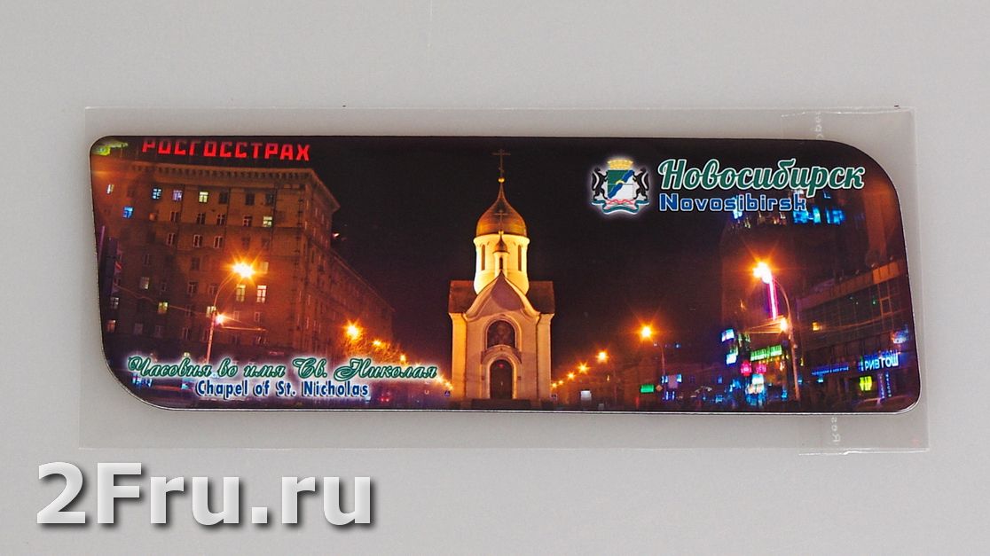 На магните изображена часовня, расположенная в самом центре Новосибирска по середине Красного проспекта, вечером. Часовня святителя и Чудотворца Николая негласно считается одним из основных символов Новосибирска.