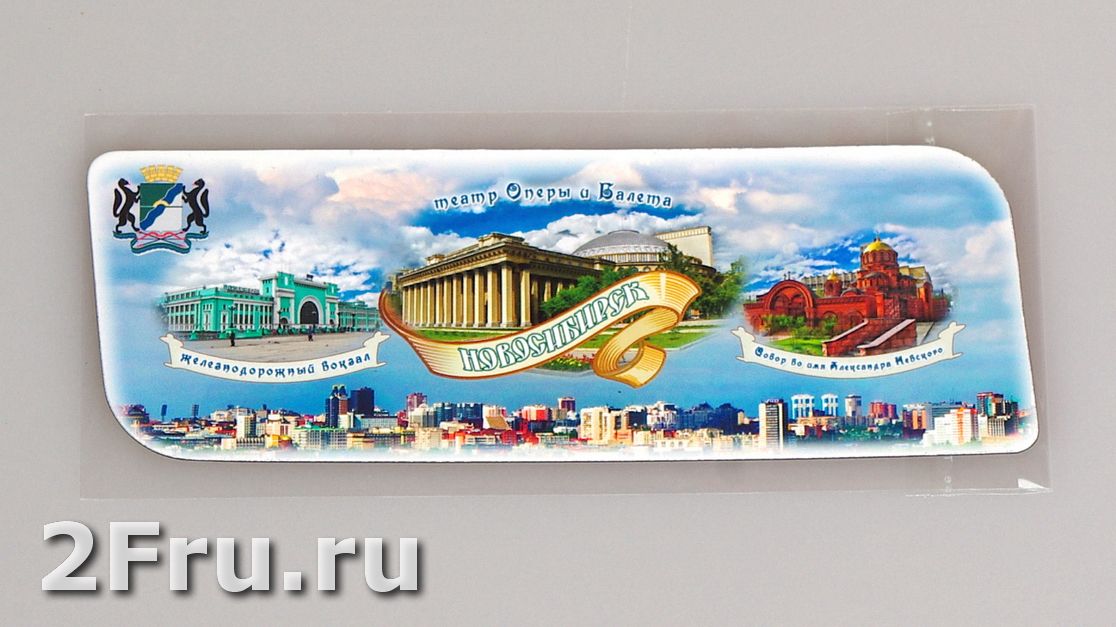 Гибкий сувенирный магнит на холодильник с коллажем из фото достопримечательностей Новосибирска на фоне панорамы города. Размеры магнита: 14х5 см., толщина - 1 мм. Магнит упакован в полипропиленовый пакет.
