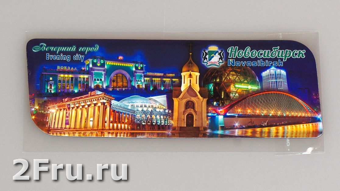 Гибкий сувенирный магнит на холодильник с коллажем из вечерних фото достопримечательностей Новосибирска. Размеры магнита: 14х5 см., толщина - 1 мм. Магнит упакован в полипропиленовый пакет.