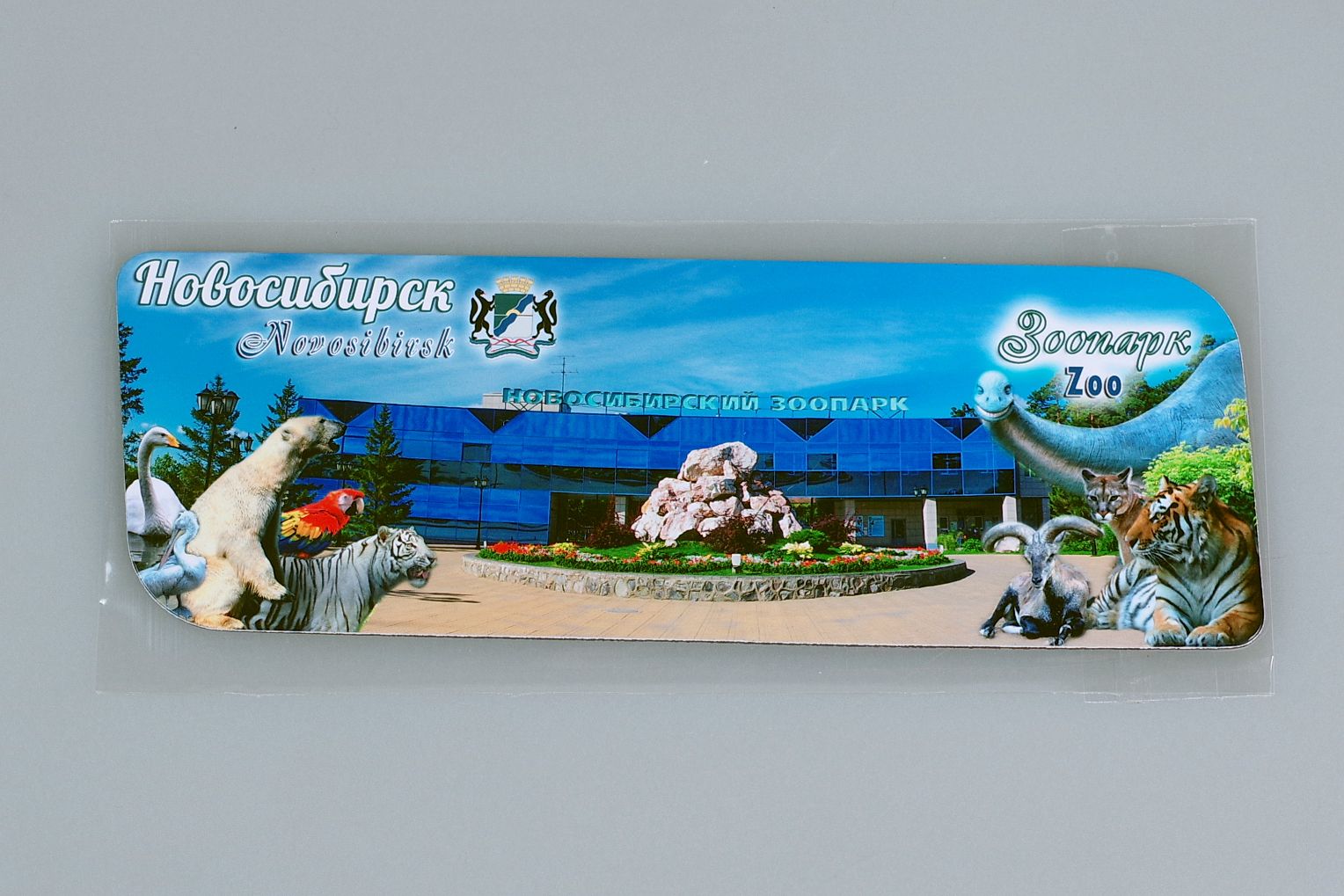 Гибкий сувенирный магнит на холодильник с животными на фоне здания Новосибирского зоопарка. Размеры магнита: 14х5 см., толщина - 1 мм. Магнит упакован в полипропиленовый пакет.