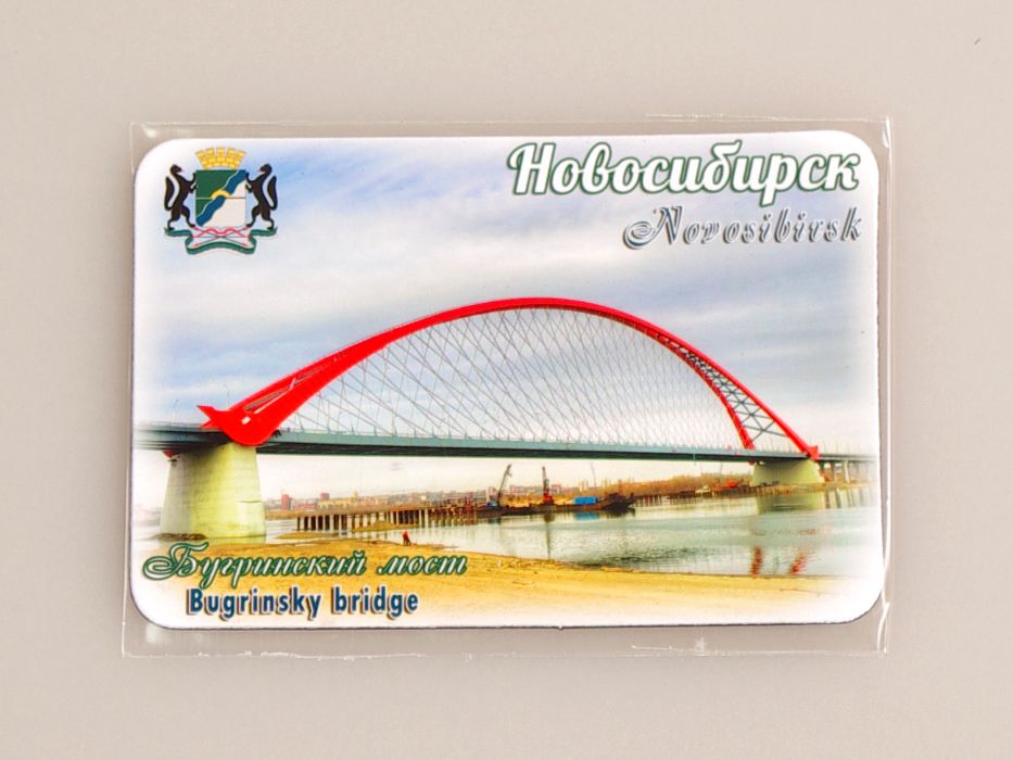 На магните изображен Бугринский мост через реку Обь. Автомобильный мост через Обь с самым длинным в СНГ арочным пролётом. Мост был открыт в 8 октября 2014 года. В будущем планируется что мост станет составной частью скоростной магистрали непрерывного действия «Юго-Западный обход» Новосибирска, которой предполагается связать федеральные трассы «Иртыш» и «Чуйский тракт».