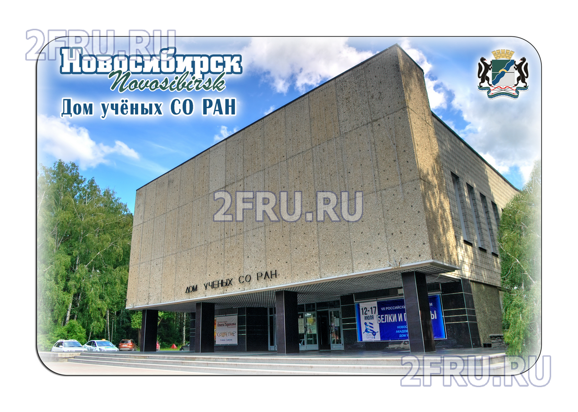 На магните изображено здание Новосибирского Дома Учёных СО РАН расположенного в Академгородке.