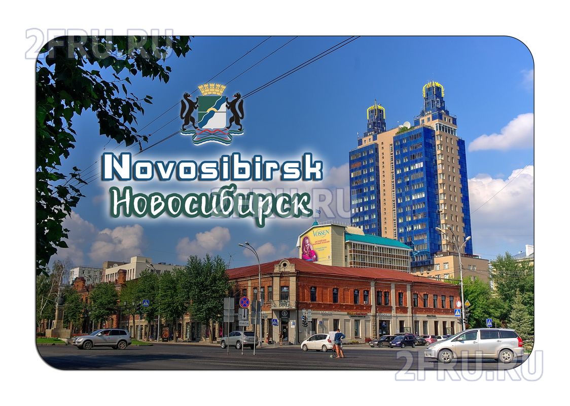 На магните изображена фотография комбинации старой и современной архитектуры старого центра Новосибирска. На проспект выходит комплекс из двух примыкающих друг к другу домов купцов Сурикова и Молчанова, постоеных в начале XX века. За ними виднеется современная синяя высотка с двумя башенками, получившая за них прозвище в народе - бэтмен.