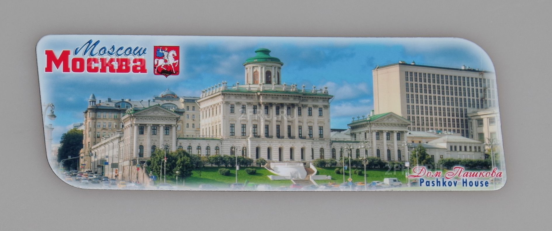 Гибкий сувенирный магнит на холодильник с фото дома Пашкова в Москве, дневной. Размеры магнита: 14х5 см., толщина - 1 мм. Магнит упакован в полипропиленовый пакет.