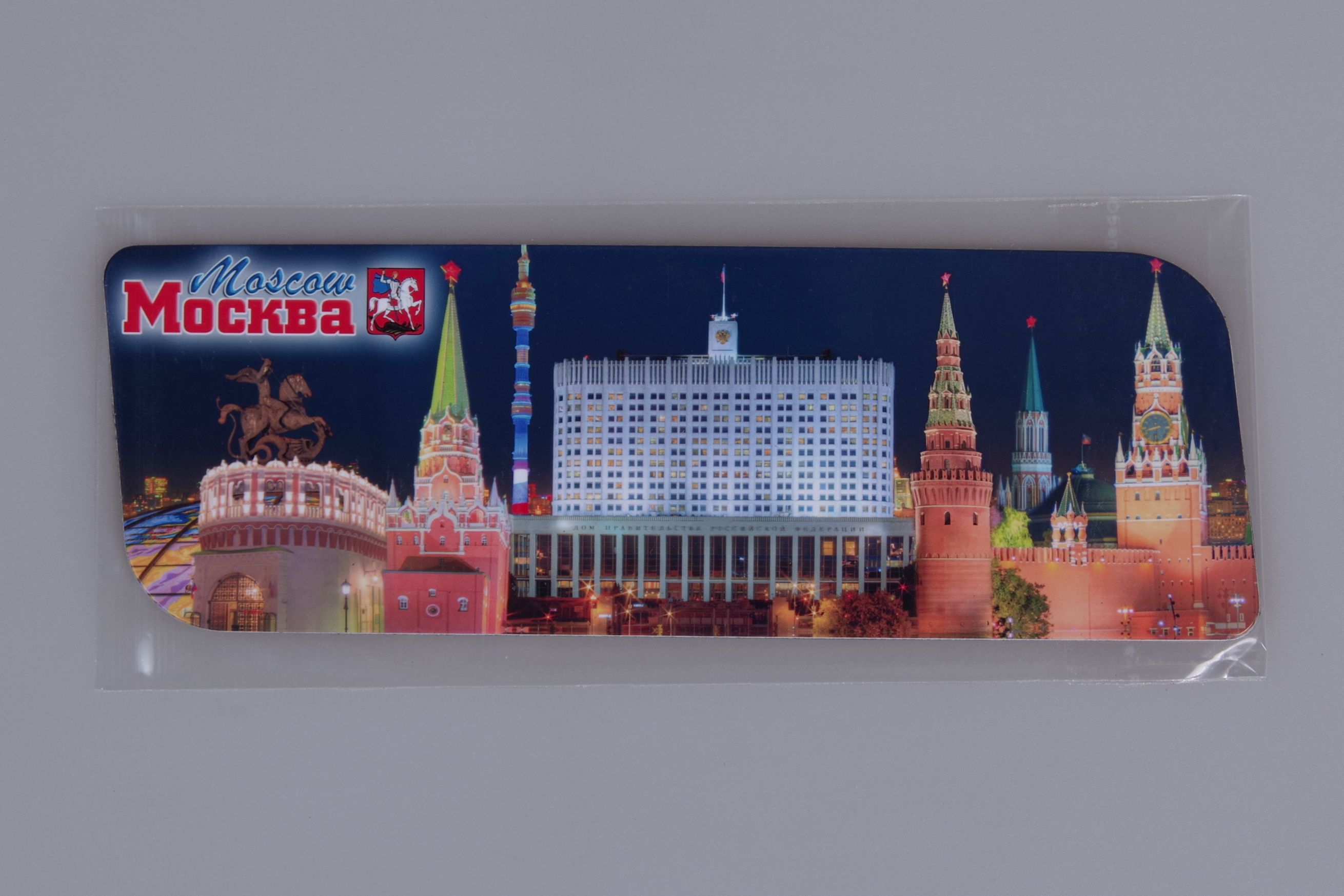 Гибкий сувенирный магнит на холодильник с коллажем из фото достопремичательностей Москвы, вечером с подсветкой. Размеры магнита: 14х5 см., толщина - 1 мм. Магнит упакован в полипропиленовый пакет.
