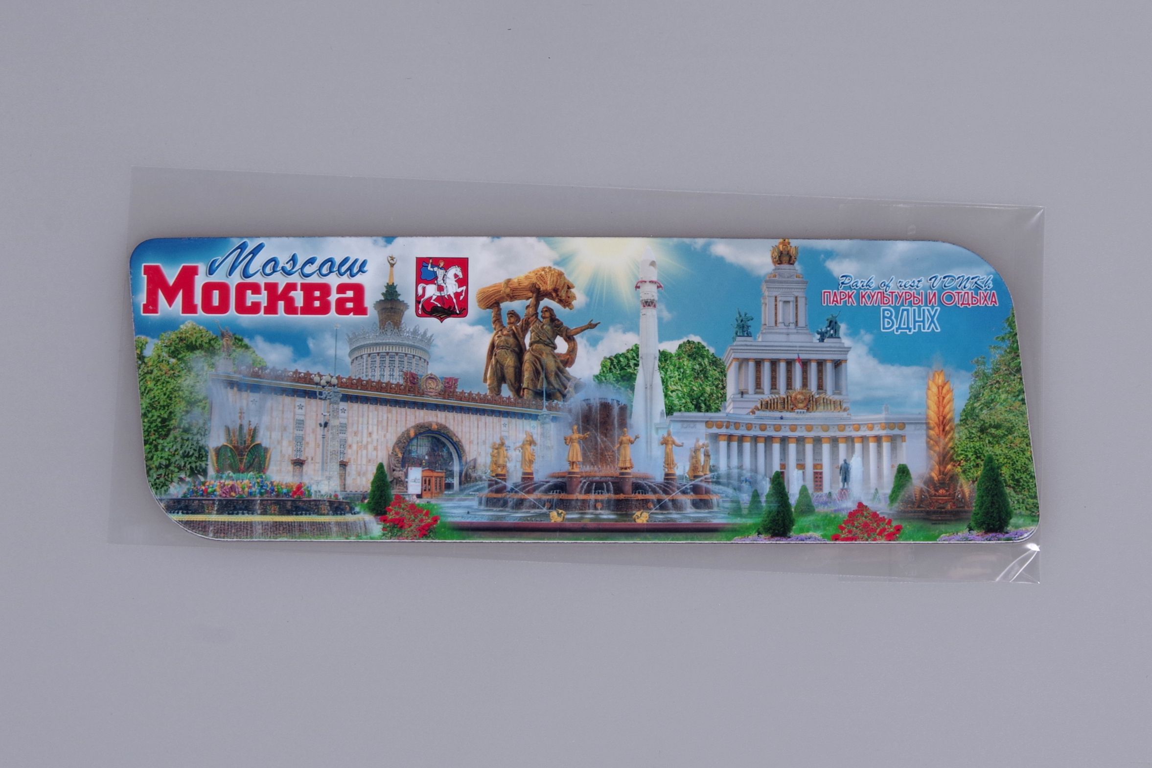 Гибкий сувенирный магнит на холодильник с коллажем достопримечательностей ВДНХ. Размеры магнита: 14х5 см., толщина - 1 мм. Магнит упакован в полипропиленовый пакет.