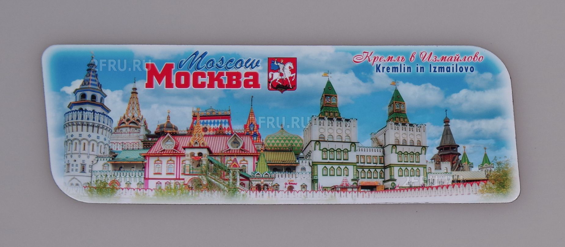 Гибкий сувенирный магнит на холодильник с фото Кремля в Измайлово, дневной. Размеры магнита: 14х5 см., толщина - 1 мм. Магнит упакован в полипропиленовый пакет.