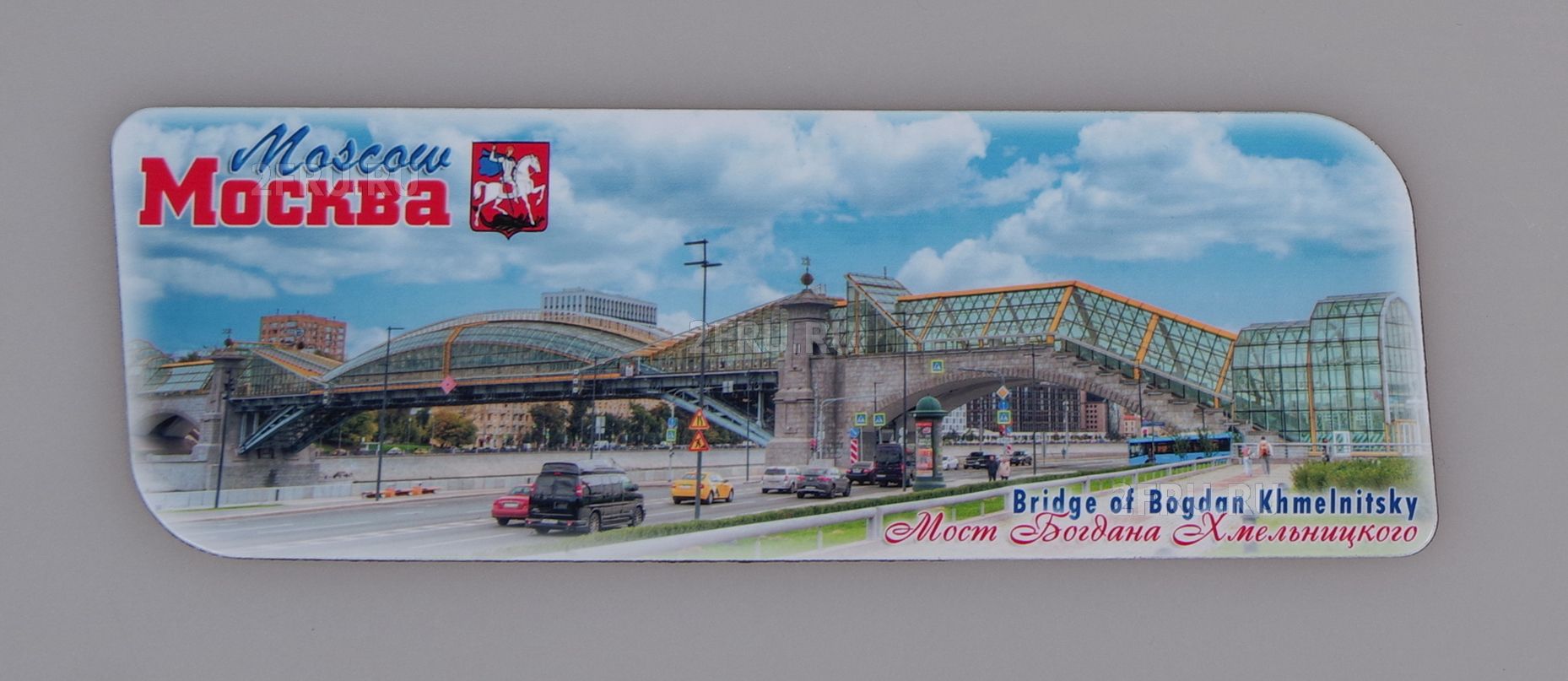 На магните изображен Мост Богдана Хмельницкого. Является арочным пешеходным мостом через Москву-реку. Мост соединяет Ростовскую и Бережковскую набережные вблизи Киевского вокзала. Открыт 1 сентября 2001 г. Масса конструкции - 1750 тонн, длина мостового пролета 135 метров, общая длина – 235 метров. Построен по проекту Е. Гапонцева вместо Краснолужского железнодорожного моста, возведенного в 1907 и демонтированного в 2000 г. От старого моста осталась арочная конструкция, которую для нового моста использовали как несущую. На мосту находятся смотровые площадки, балконы.