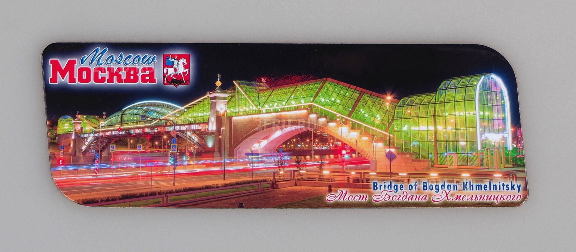На магните изображен вечерний вид Моста Богдана Хмельницкого. Является арочным пешеходным мостом через Москву-реку. Мост соединяет Ростовскую и Бережковскую набережные вблизи Киевского вокзала. Открыт 1 сентября 2001 г. Масса конструкции - 1750 тонн, длина мостового пролета 135 метров, общая длина – 235 метров. Построен по проекту Е. Гапонцева вместо Краснолужского железнодорожного моста, возведенного в 1907 и демонтированного в 2000 г. От старого моста осталась арочная конструкция, которую для нового моста использовали как несущую. На мосту находятся смотровые площадки, балконы.