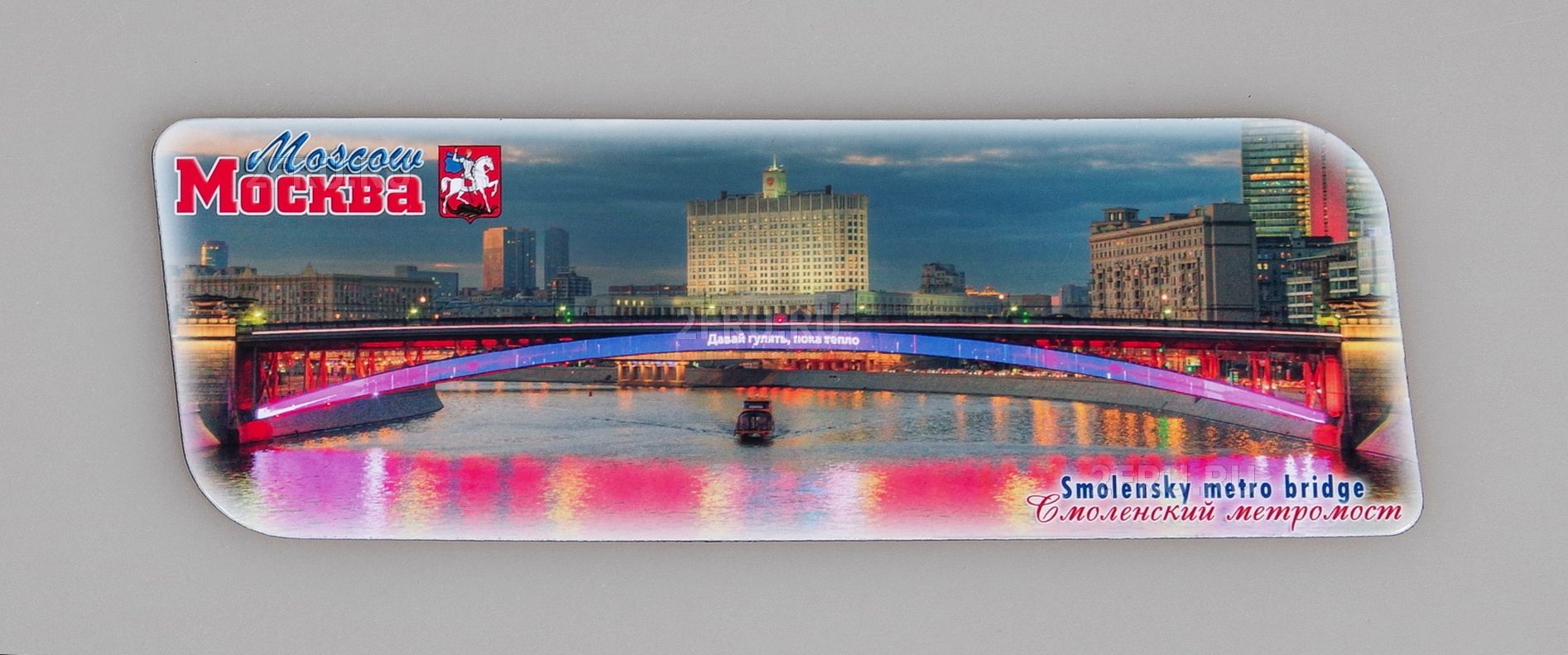 Гибкий сувенирный магнит на холодильник с фото Смоленского метромоста. Размеры магнита: 14х5 см., толщина - 1 мм. Магнит упакован в полипропиленовый пакет.