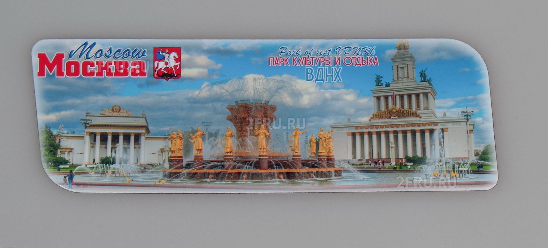 Гибкий сувенирный магнит на холодильник с фото Московского парка культуры и отдыха ВДНХ, дневной. Размеры магнита: 14х5 см., толщина - 1 мм. Магнит упакован в полипропиленовый пакет.