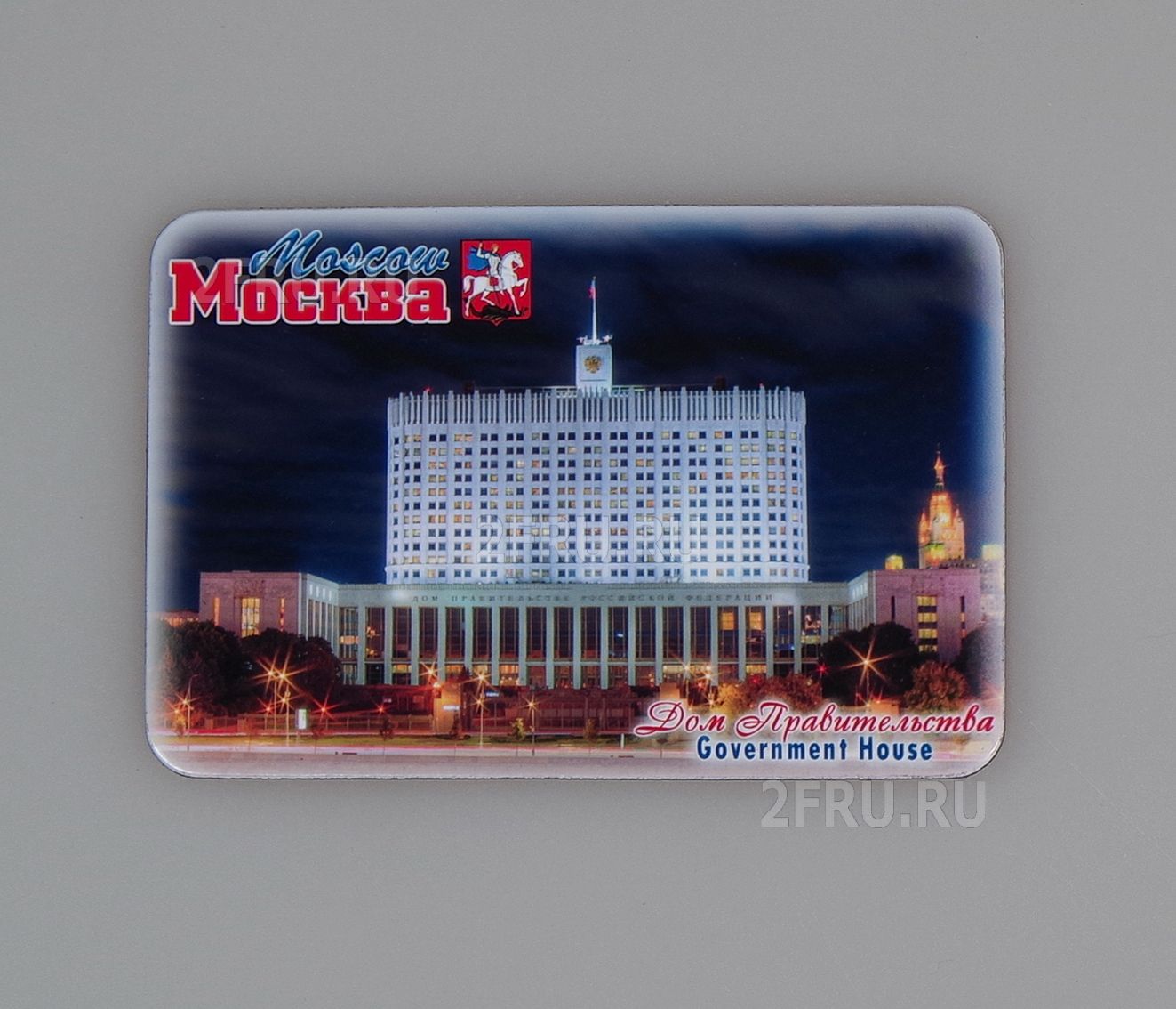 На магните изображен вечерний вид Дома Правительства Российской Федерации (Белый Дом). Адрес: Москва, Краснопресненская набережная, 2. Построен в 1965 - 1981 годах по проекту знаменитого архитектора Дмитрия Чечулина. Площадь Дома Правительства составляет 732 тысячи м2, а суммарная площадь офисных помещений – 172,7 тысячи м2. Высота здания Дома Правительства Российской Федерации с флагштоком - 119 м. С 1994 года в нем работает Правительство Российской Федерации.