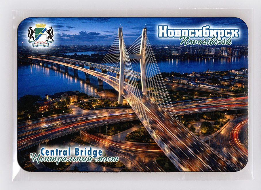 Гибкий сувенирный магнит на холодильник с фото Центрального моста вечером, Новосибирск. Размеры магнита: 8,4х5,7 см., толщина - 1 мм. Магнит упакован в полипропиленовый пакет.