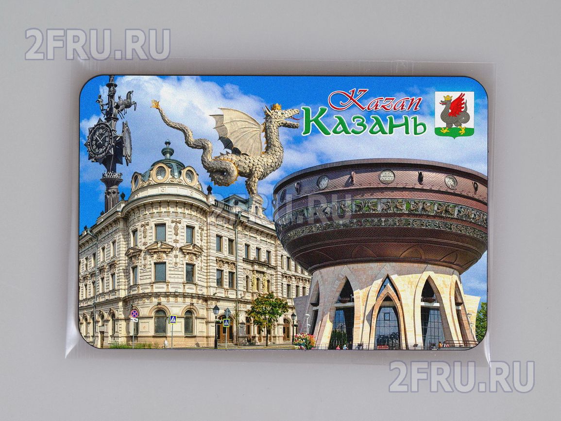 Гибкий сувенирный магнит на холодильник с коложем из фото достопримечательностей Казани. Размеры магнита: 8,4х5,7 см., толщина - 1 мм. Магнит упакован в полипропиленовый пакет.
