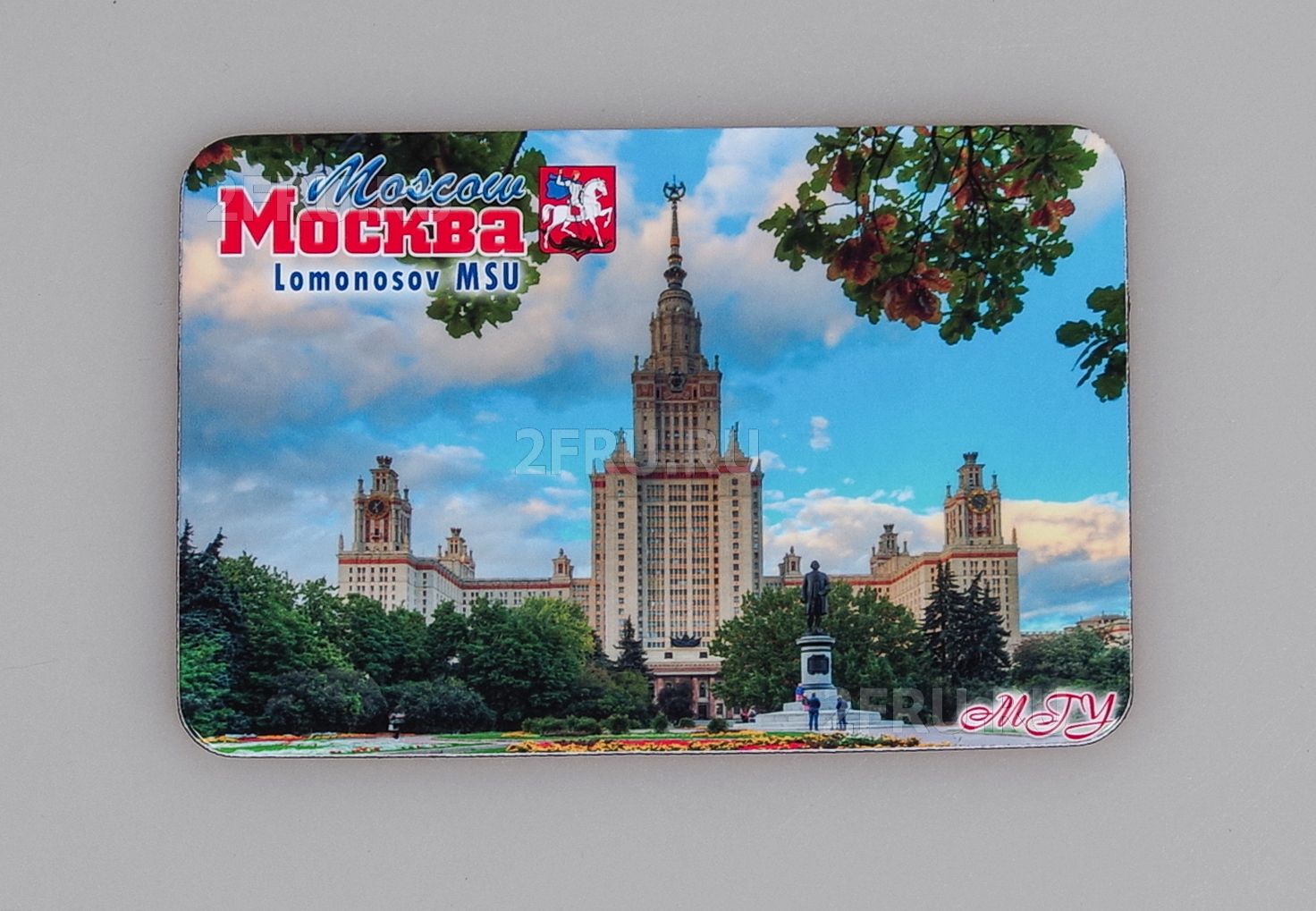 На магните изображен «МГУ». В центре композиции представлена живописная аллея с цветами и памятником М.В. Ломоносову, открытому в 1954 году. Полное наименование: Федеральное государственное бюджетное образовательное учреждение высшего образования «Московский государственный университет имени М.В. Ломоносова» - один из старейших и крупнейших классических университетов России, центр российской культуры и науки, расположенный в Москве. МГУ был основан 25 января 1755 года, с тех времен в России и празднуют праздник 25 января - День студента. Главный корпус МГУ на Воробьевых горах был построен в 1953 году. Входит в состав семи сталинских высоток, является знаковой достопримечательностью столицы, архитектурный символ столицы. Центральный сектор здания содержит 36 этажей, боковые башни достигают 24 этажа, высота главного здания в центральной части 239,5 метров, сложная гармоничная композиция была создана по принципу постепенного нарастания высоты к центральному корпусу. Из интересных фактов - на правой башне главного здания расположены самые большие часы в Москве, циферблат диаметр 8,74 метра, минутная стрелка имеет длину 4,1 метра, вес 39 килограммов. В распоряжении университета более 600 сооружений. Университет включает в себя 15 научно-исследовательских институтов, 43 факультета, более 300 кефедр и семь филиалов, обучается свыше 40 тысяч студентов и аспирантов, проводятся подготовительные занятия для более 10 тысяч школьников.