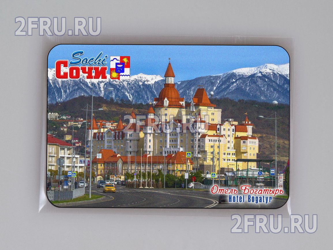 Гибкий сувенирный магнит на холодильник с фотографией Адлерского отеля Богатырь на фоне гор. Размеры магнита: 8,4х5,7 см., толщина - 1 мм. Магнит упакован в полипропиленовый пакет.