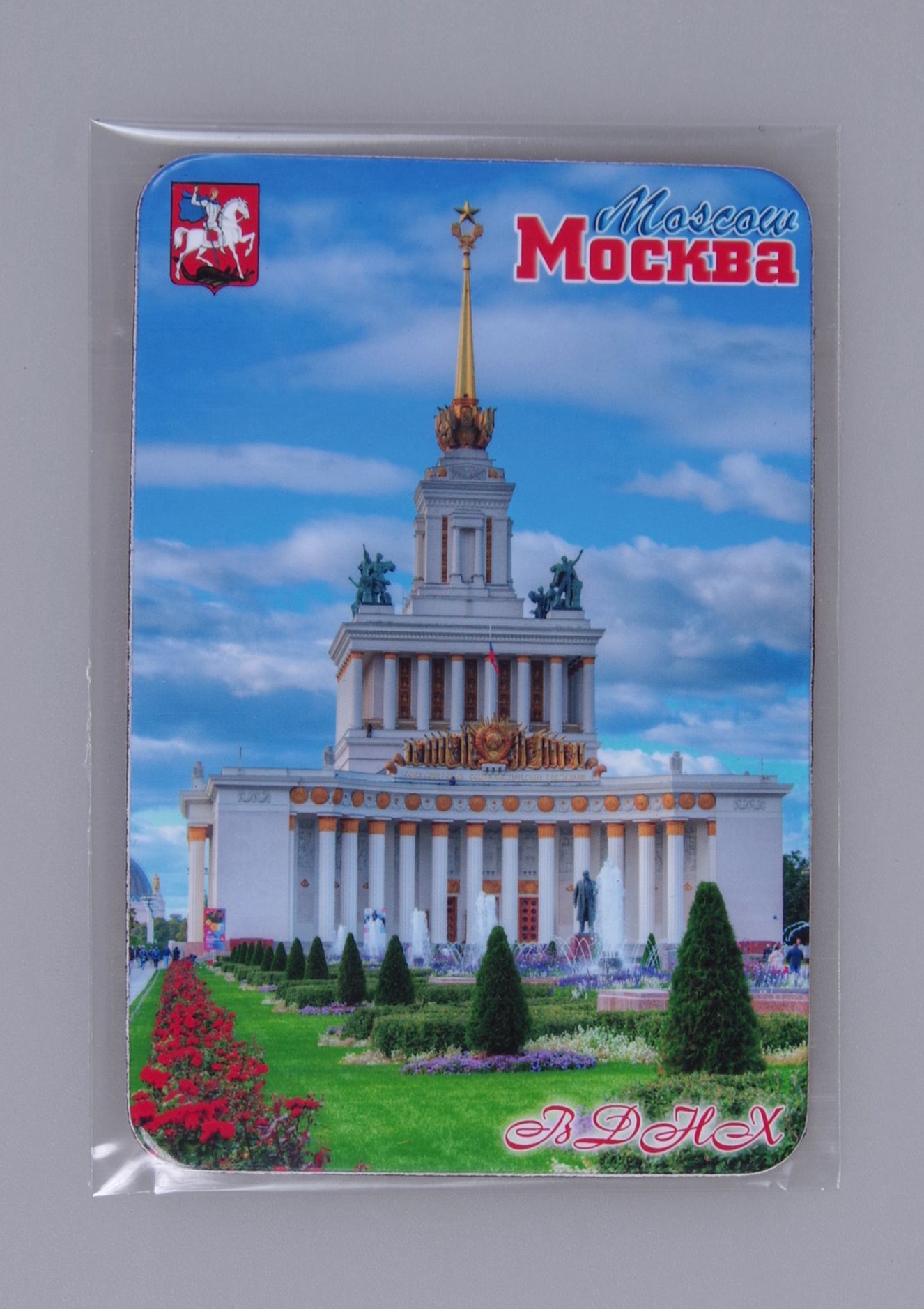На магните изображен павильон ВДНХ «Центральный» с аллеей. Адрес: Москва, проспект Мира (ВДНХ), 119, ст. 1. Главный павильон был построен в 1954 году, по проекту Е.А. Столярова и Г.В. Щуко. Один из главных и наиболее монументальных сооружений выставки. Высота павильона вместе со шпилем достигает 97 метров, а общая площадь здания - 9 378,2 м2. От Главного входа к Главному павильону ведет аллея из 14 чугунных фонтанов. Здание украсили по четырем сторонам света скульптурами рабочих и колхозниц. ВДНХ входит в 50 крупнейших выставочных центров мира и второй по величине в Москве.