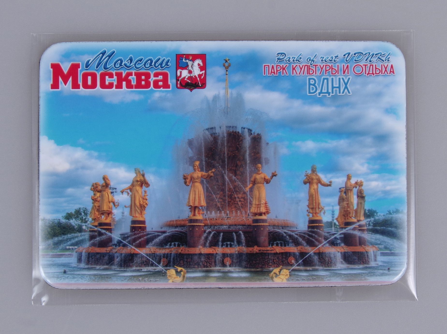 Гибкий сувенирный магнит на холодильник с фото ВДНХ фонтан, день. Размеры магнита: 8,4х5,7 см., толщина - 1 мм. Магнит упакован в полипропиленовый пакет.