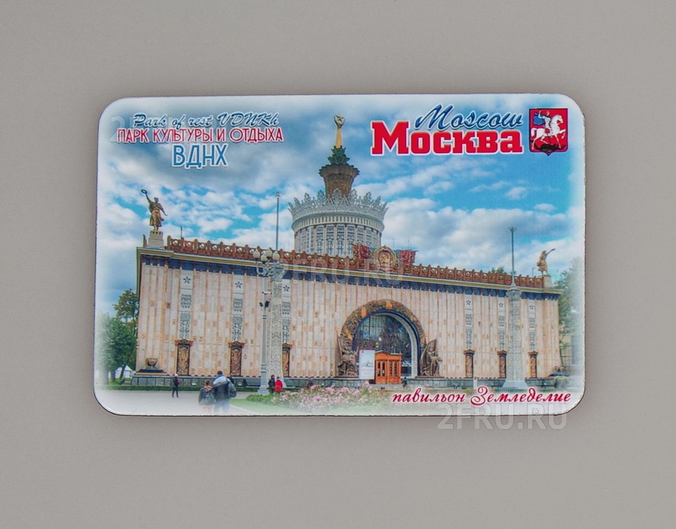 На магните изображен павильон «Земледелие» ВДНХ. Адрес: Москва, проспект Мира (ВДНХ), 119 ст.58. Располагается в самом сердце центральной аллеи ВДНХ, одни из красивейших павильонов. Объём его составляет 24 тысячи м³, общая площадь залов - 1600 м², высота основного объёма здания - 15,5 м, с куполом - 26 м, со шпилем - 42 м. Архитектор А.А. Таций, построен в 1954 году. Неповторимый архитектурный облик придала ему отделка декоративной керамикой, смальтой. Скульптуры, украсившие крышу павильона, для большей выразительности облицованы золотой мозаикой. Стены павильона выполнены из керамических блоков на стальном каркасе, цоколь из серого полированного гранита. Углы павильона увенчаны четырьмя скульптурами девушек с венками, скульптуры облицованы цветной и золотой смальтой. Входная арка обрамлена огромным майоликовым венком из злаков, фруктов и овощей. Арка с изображением Переяславской рады заполнена витражом.