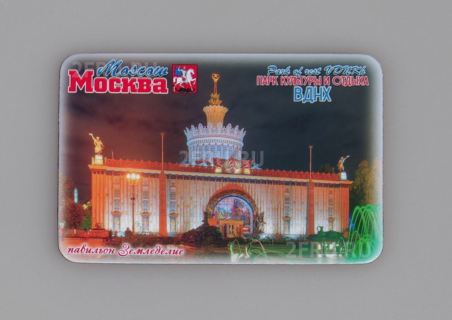 На магните изображен павильон «Земледелие» ВДНХ ночной. Адрес: Москва, проспект Мира (ВДНХ), 119 ст.58. Располагается в самом сердце центральной аллеи ВДНХ, одни из красивейших павильонов. Объём его составляет 24 тысячи м³, общая площадь залов - 1600 м², высота основного объёма здания - 15,5 м, с куполом - 26 м, со шпилем - 42 м. Архитектор А.А. Таций, построен в 1954 году. Неповторимый архитектурный облик придала ему отделка декоративной керамикой, смальтой. Скульптуры, украсившие крышу павильона, для большей выразительности облицованы золотой мозаикой. Стены павильона выполнены из керамических блоков на стальном каркасе, цоколь из серого полированного гранита. Углы павильона увенчаны четырьмя скульптурами девушек с венками, скульптуры облицованы цветной и золотой смальтой. Входная арка обрамлена огромным майоликовым венком из злаков, фруктов и овощей. Арка с изображением Переяславской рады заполнена витражом. Подсветка и иллюминация подчеркивает красоту здания, демонстрирует проработанность и его детальность.